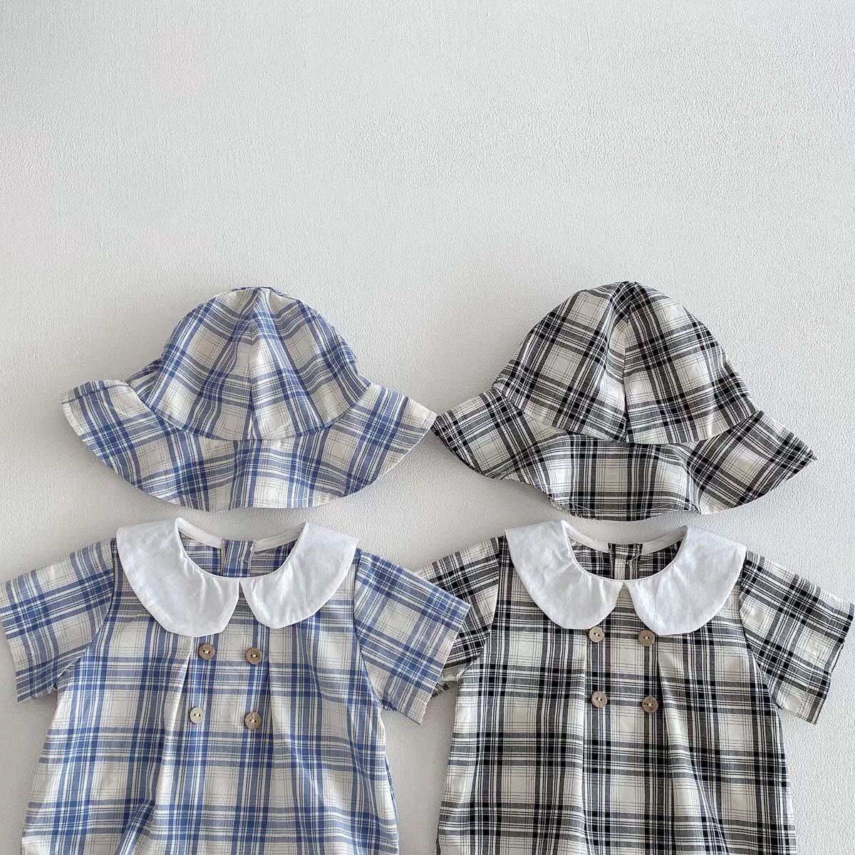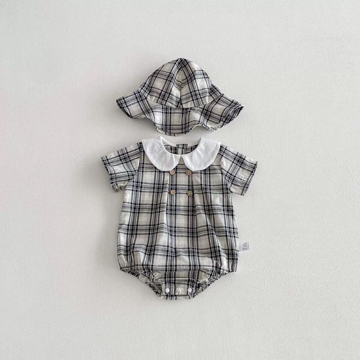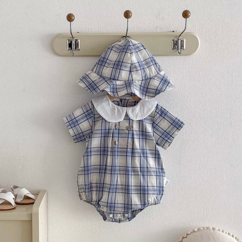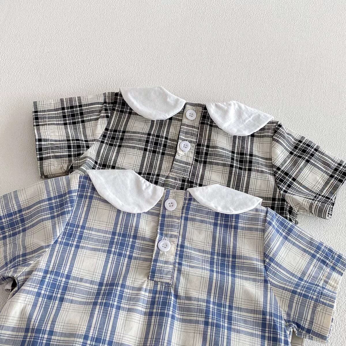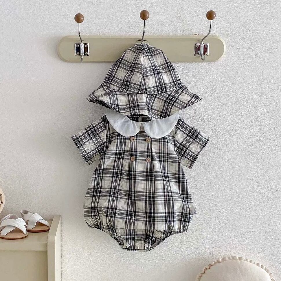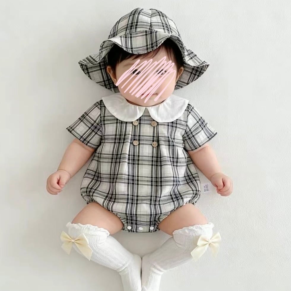 【2color】帽子付き丸襟チェック柄ロンパース