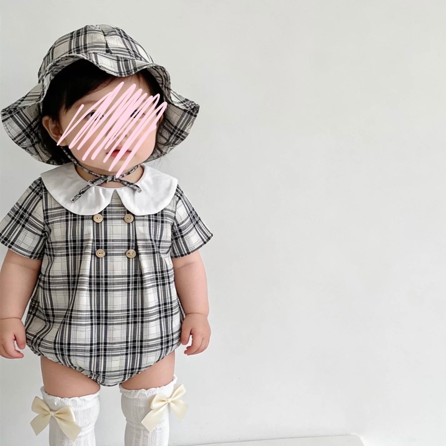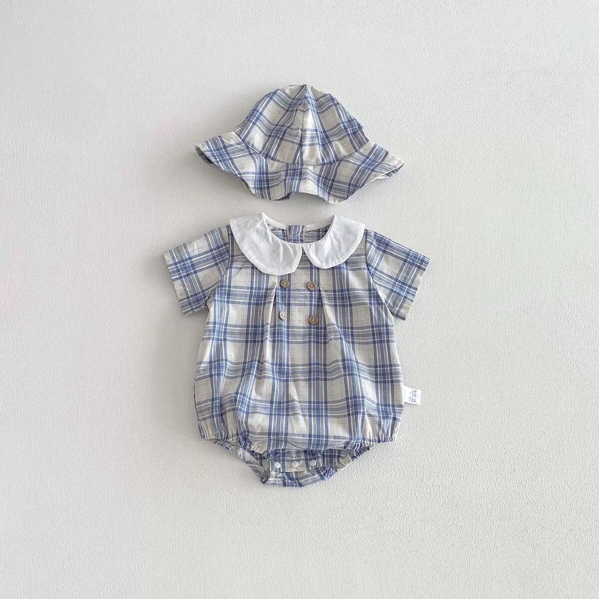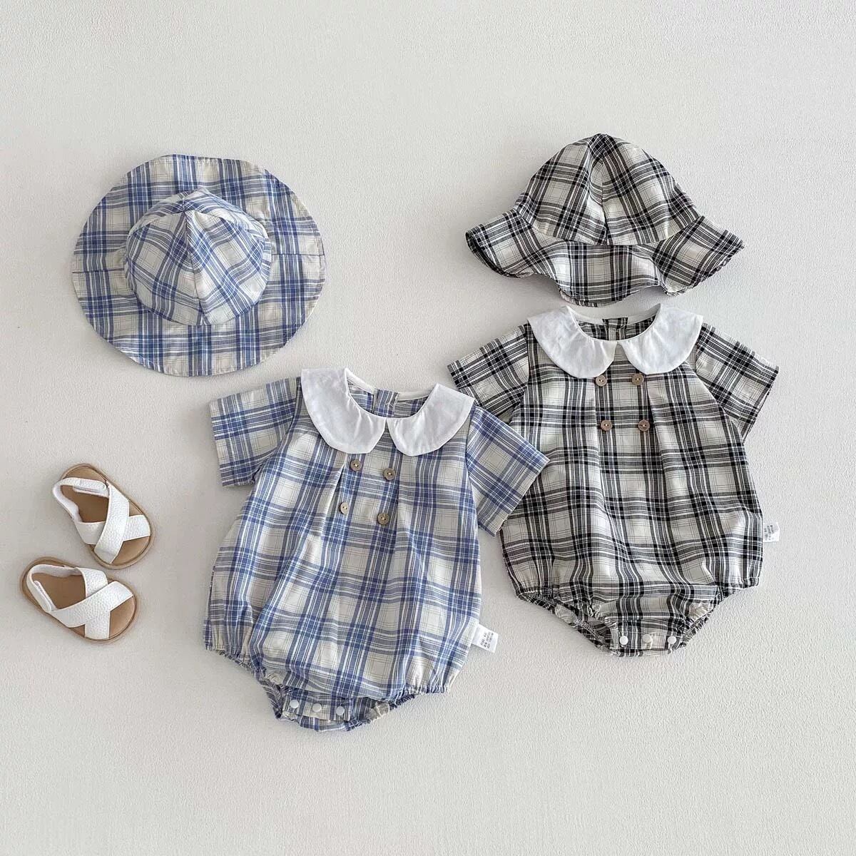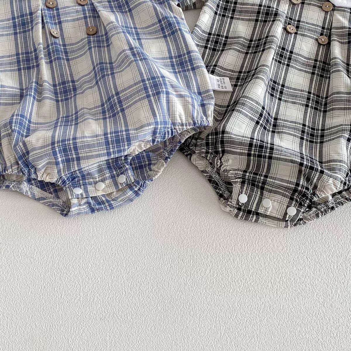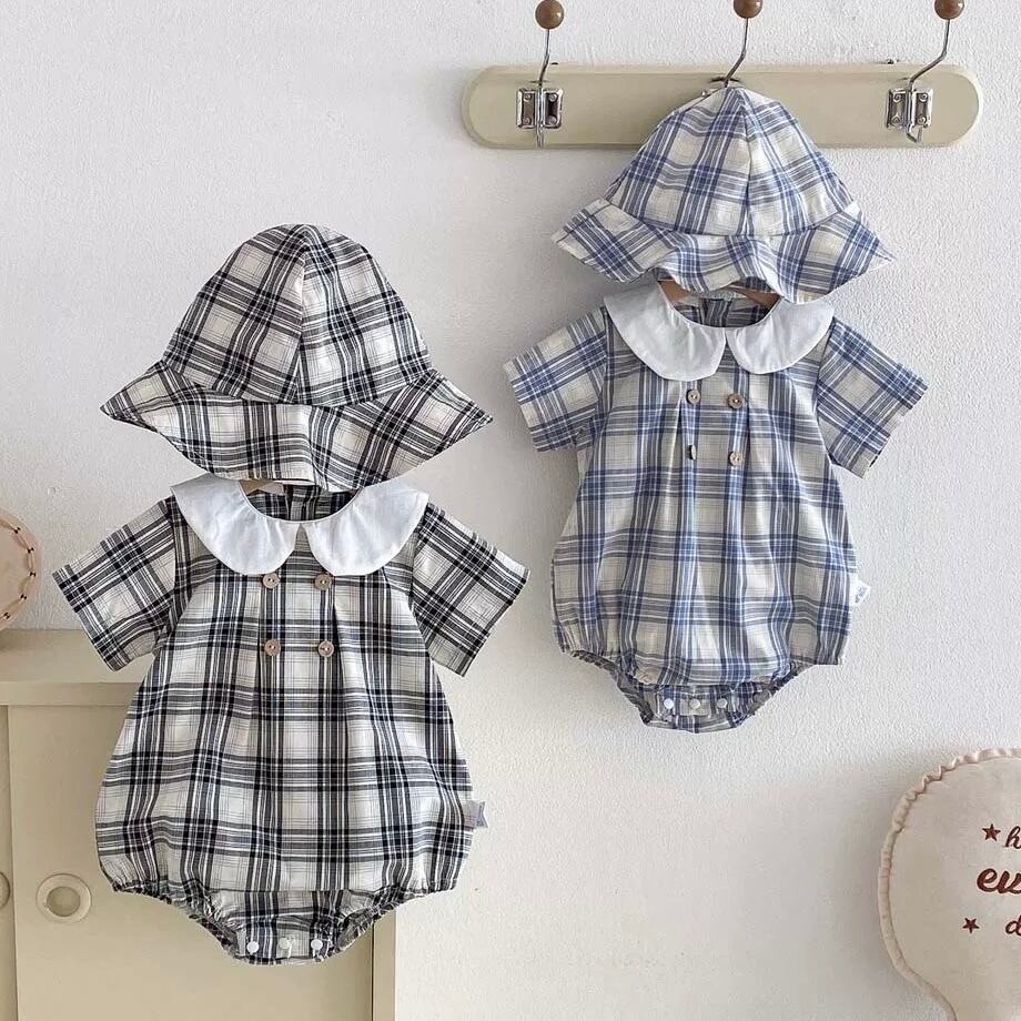 【2color】帽子付き丸襟チェック柄ロンパース