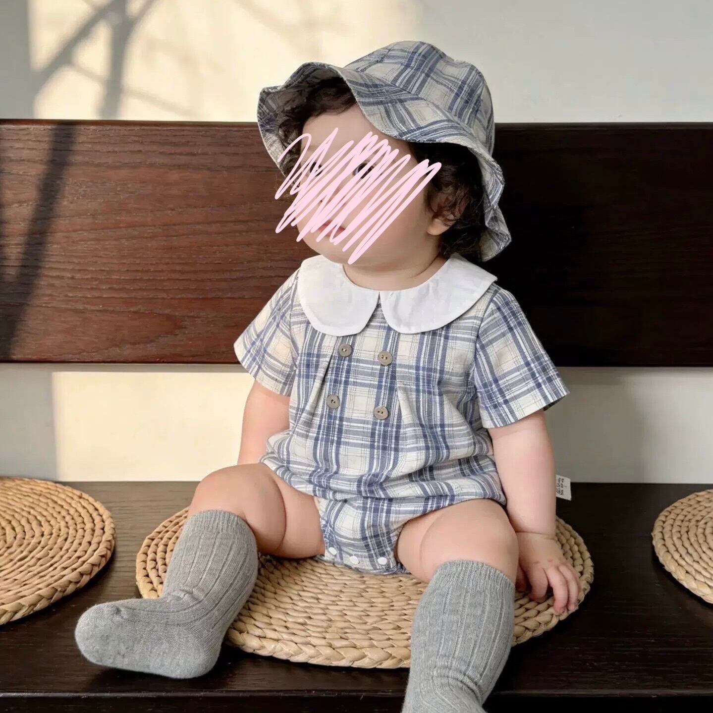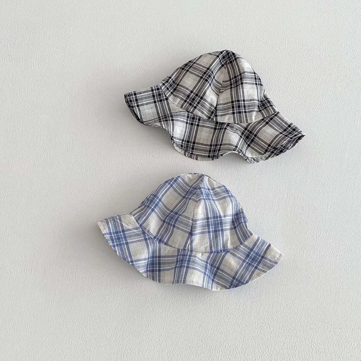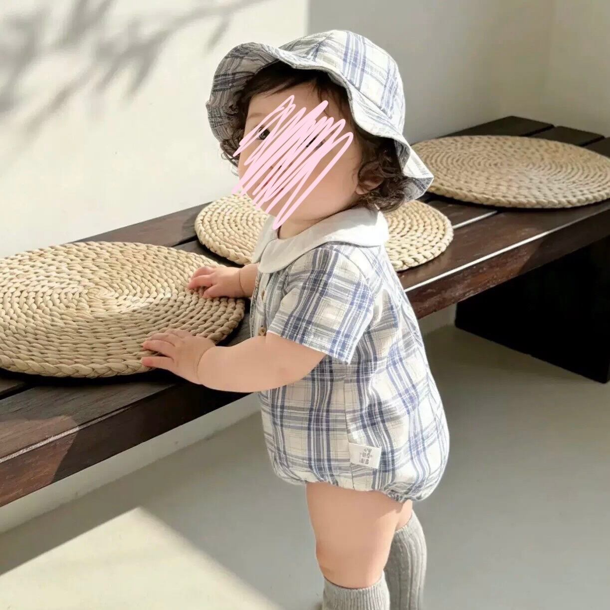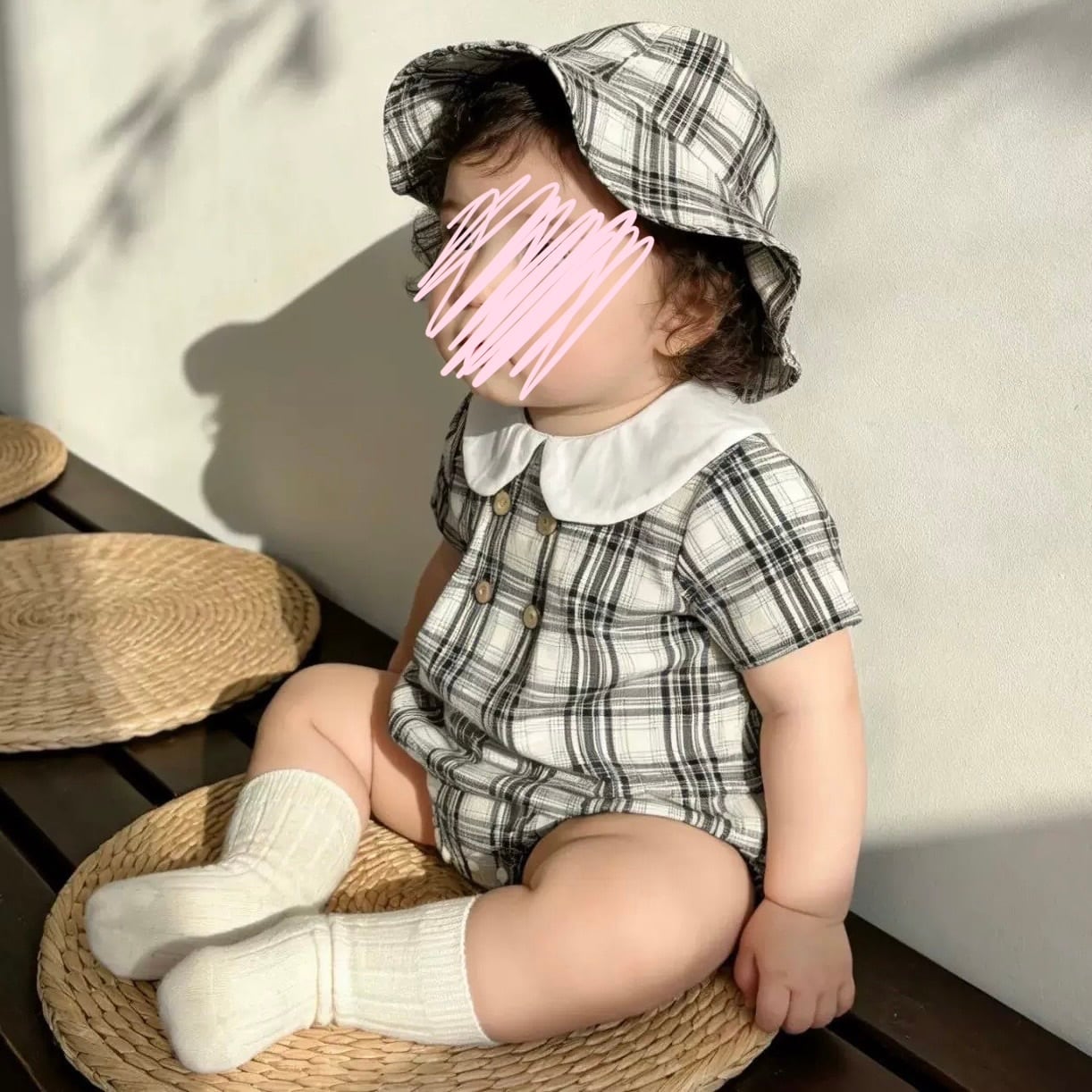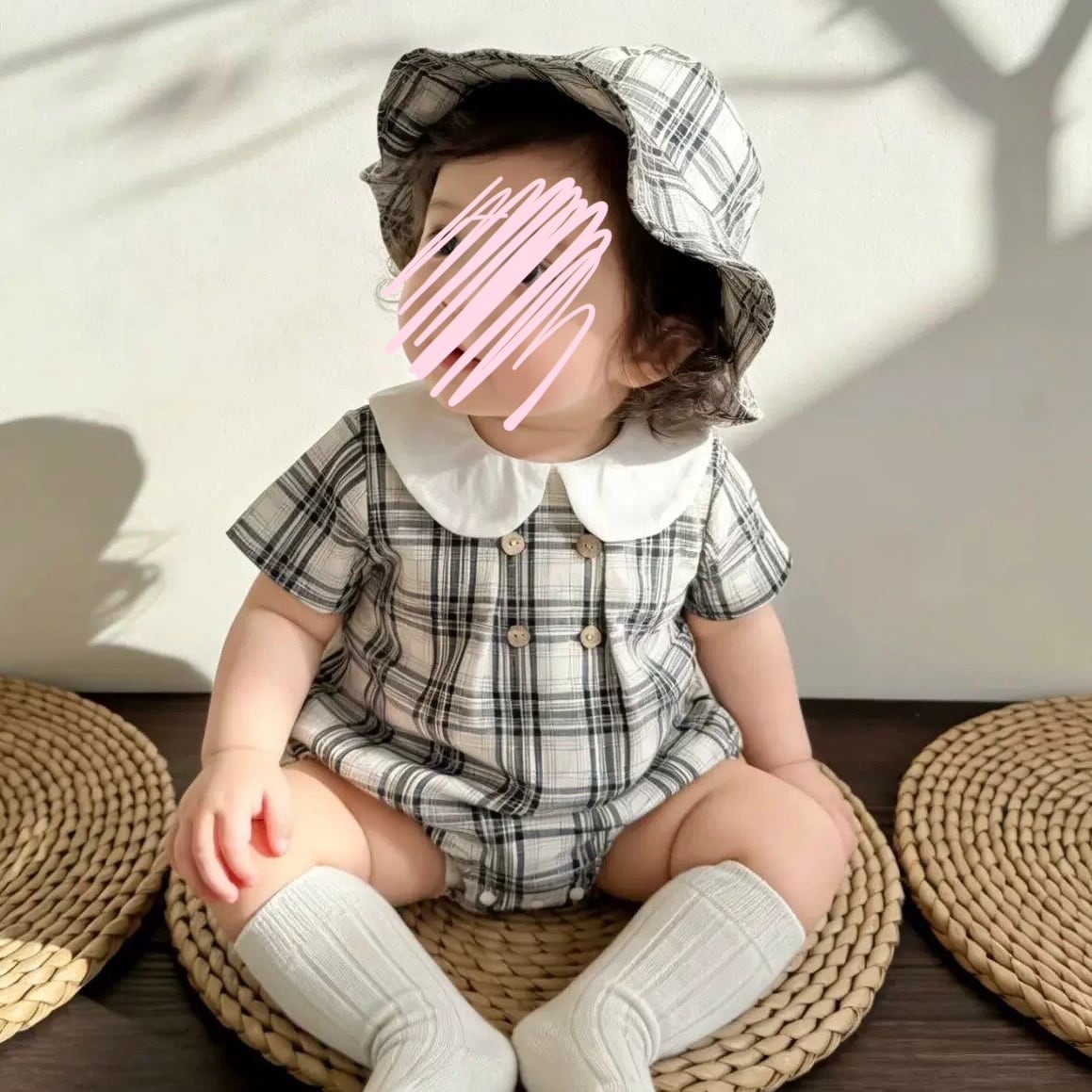 【2color】帽子付き丸襟チェック柄ロンパース